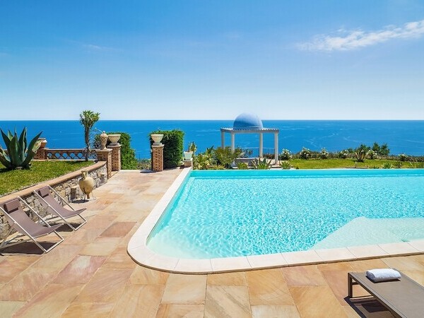 Découvrez Gran Villa Taormina, une villa exclusive avec piscine d'eau salée privée, vue imprenable sur la mer et équipements modernes. Idéalement située pour explorer Taormina, l'Etna et les plages de Giardini Naxos.