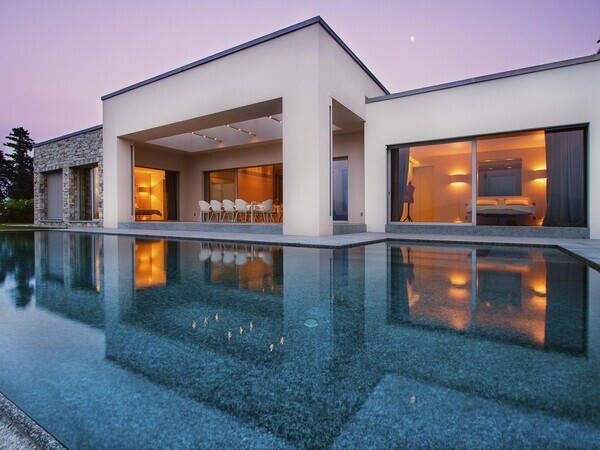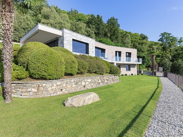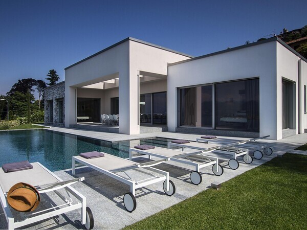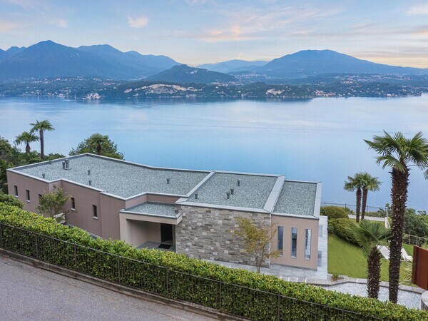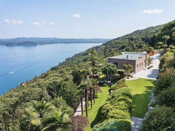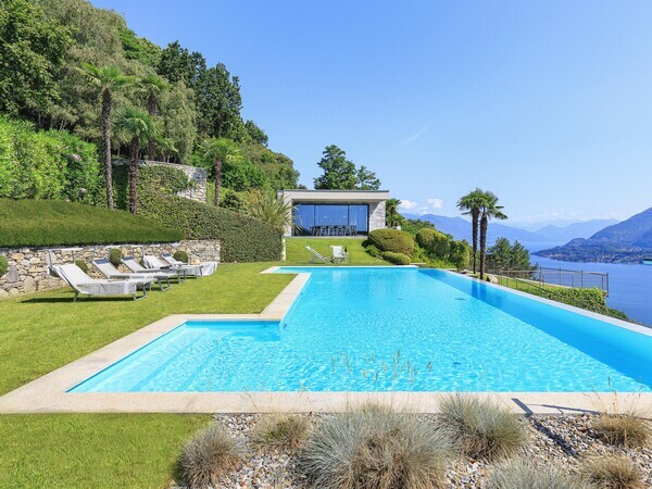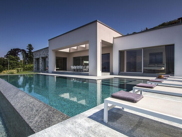 Villa Falcone au lac Majeur : villa moderne avec piscine à débordement, terrasse, intérieurs lumineux et jardin méditerranéen – luxe, calme et vue sublime.