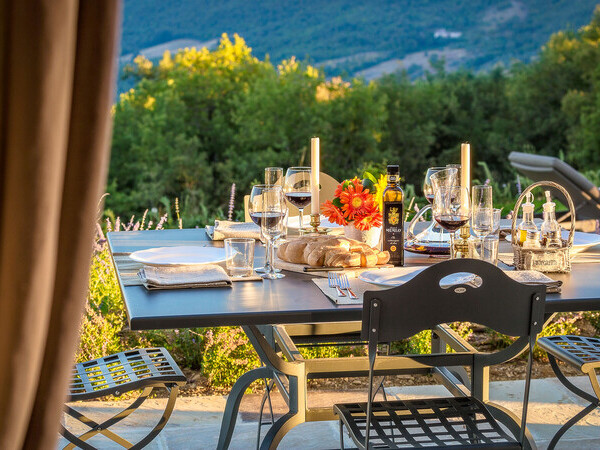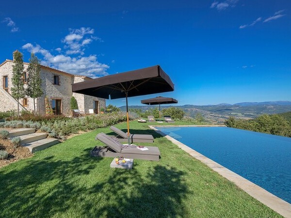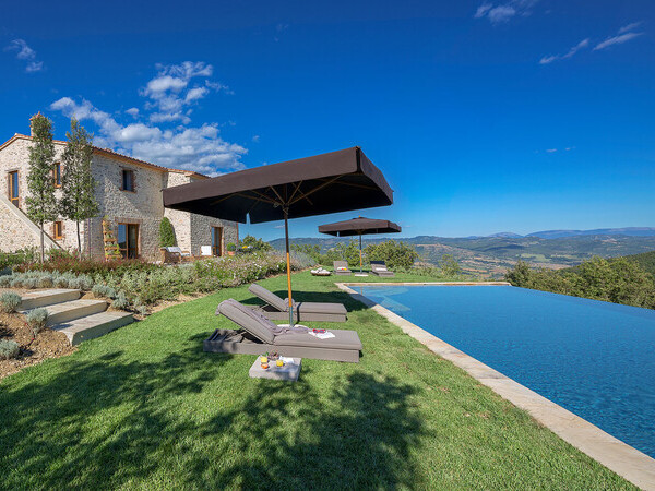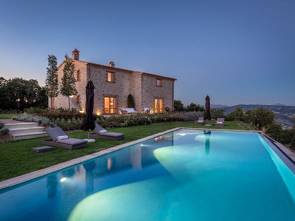 Découvrez la Villa Santa Croce avec piscine chauffée, intérieur élégant et vue panoramique à 360°. Près du golf d'Antognolla, idéale pour la détente et la tranquillité.