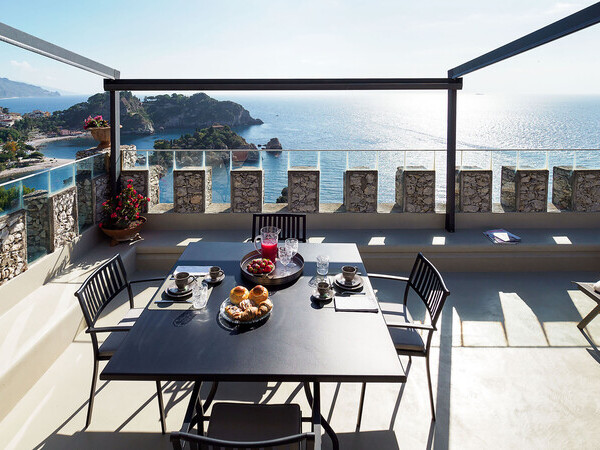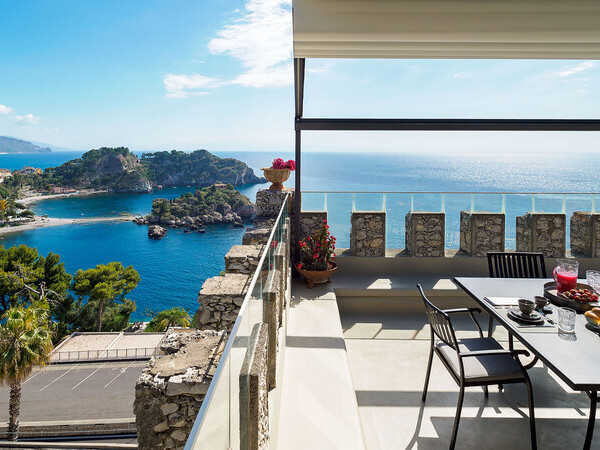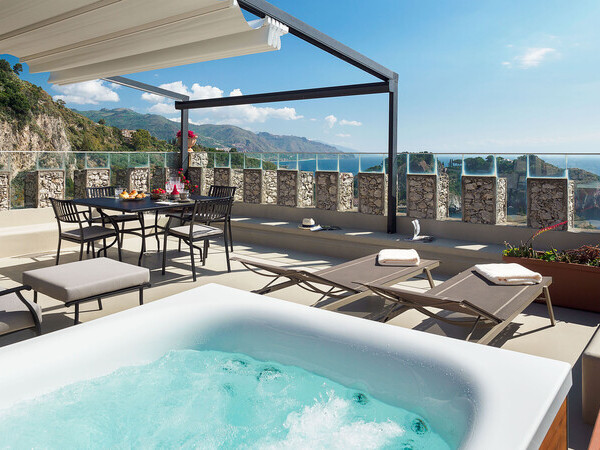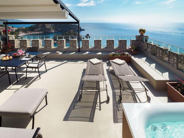 Découvrez Torre Isola Bella, un appartement unique dans une tour historique à Taormina avec jacuzzi et vue imprenable sur la baie d'Isola Bella. Luxe et intimité assurés.